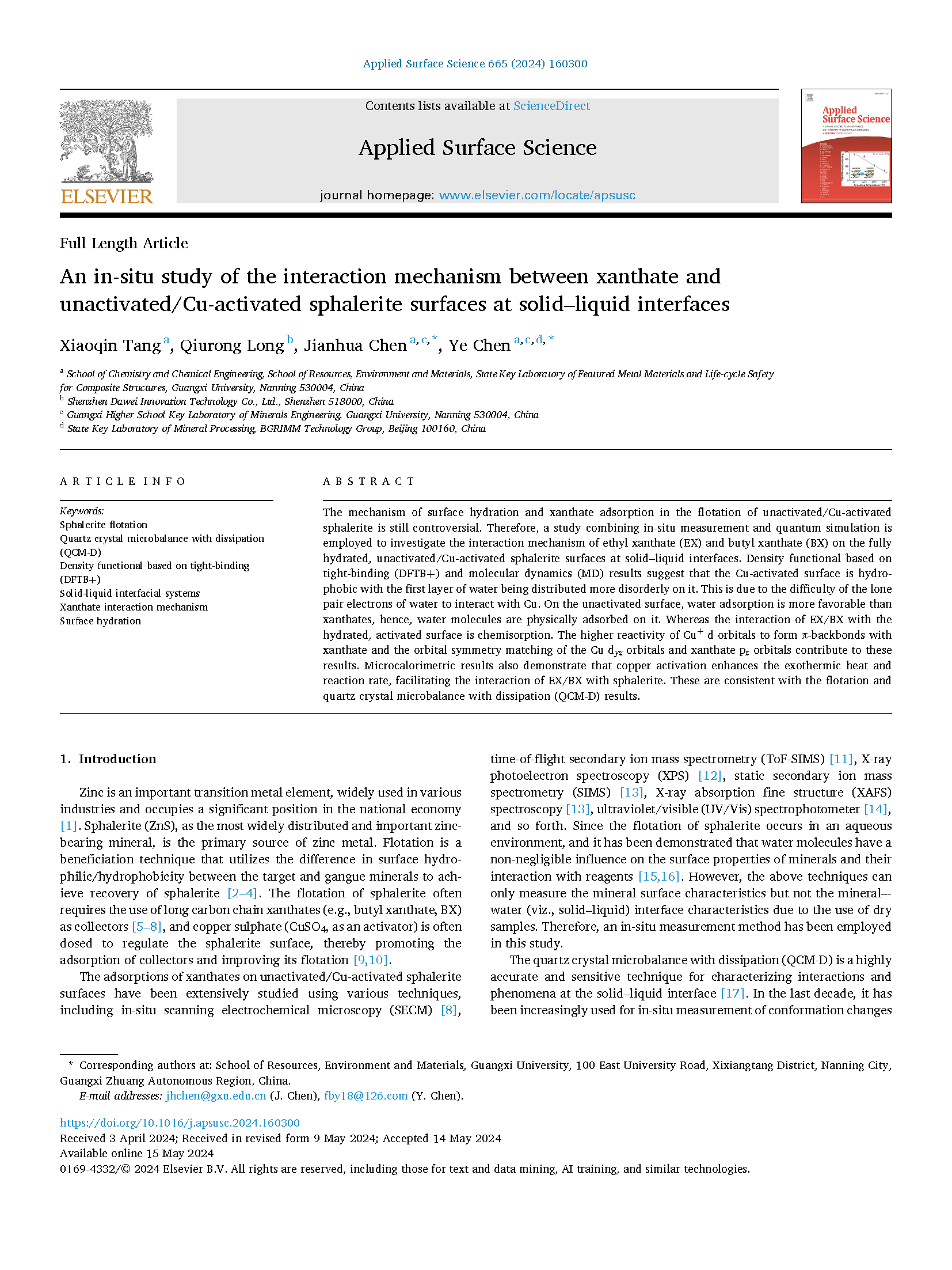 近期,伟德国际1946bv官网(以下简称“伟德国际1946bv官网”、“公司”)郴州锂电新能源产业项目(以下简称“伟德国际1946bv官网郴州锂电项目”)采选基地研发团队负责人龙秋容博士与广西大学在读博士研究生唐潇琴等人携手合作,在国际知名SCI一区期刊《应用与表面科学》上成功发表了题为《未活化/铜活化闪锌矿表面与捕收剂黄药固液相互作用机理的原位研究》的论文。该研究深入剖析了闪锌矿在不同活化状态下的表面性质以及其与黄药(一种常用硫化矿物捕收剂)之间的固液相互作用机制。