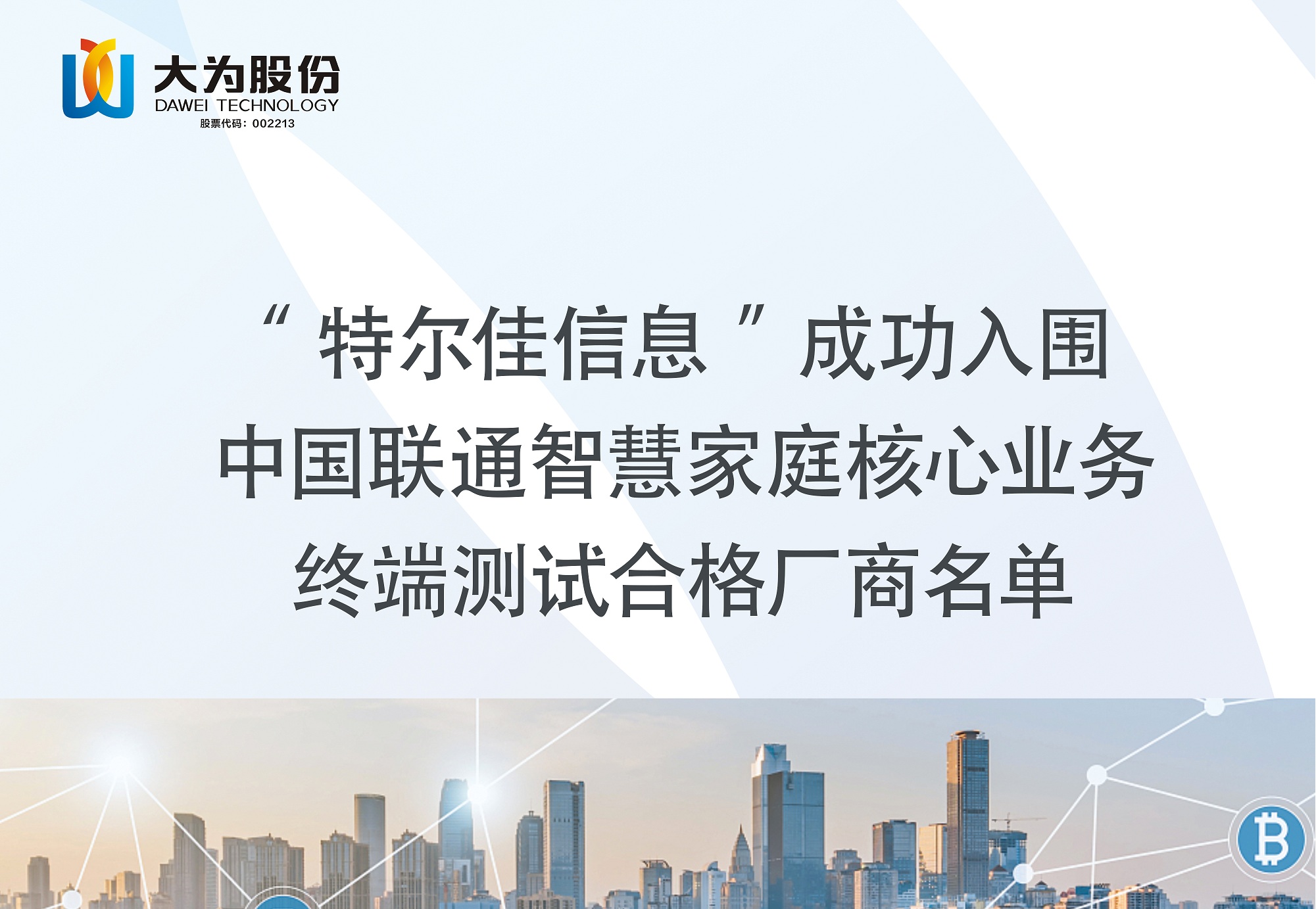 近日,中国联通印发《中国联通智慧家庭核心业务终端测试合格厂商名单(2022年7月评审通过)》的通知。伟德国际1946bv官网(简称“公司”或“伟德国际1946bv官网”)旗下全资子公司深圳市特尔佳信息技术有限公司(简称“特尔佳信息”)凭借可靠的产品质量、优质的服务和良好的企业信誉,经过严格评审,成功入围中国联通智慧家庭核心业务终端测试合格厂商名单,将进一步推动公司运营商业务的发展。